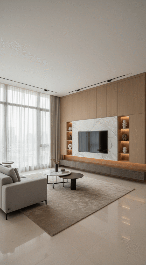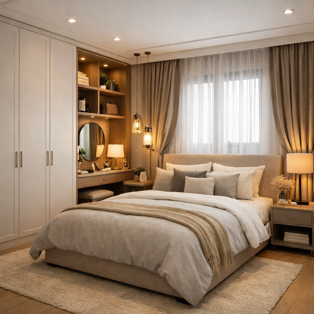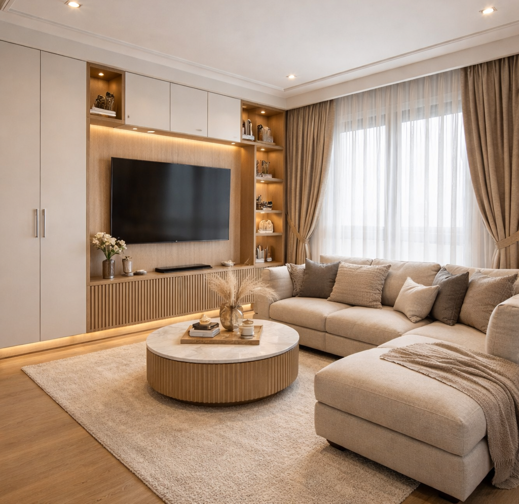 Custom cabinets, TV units, and curtains for apartments and villas with modern finishing.